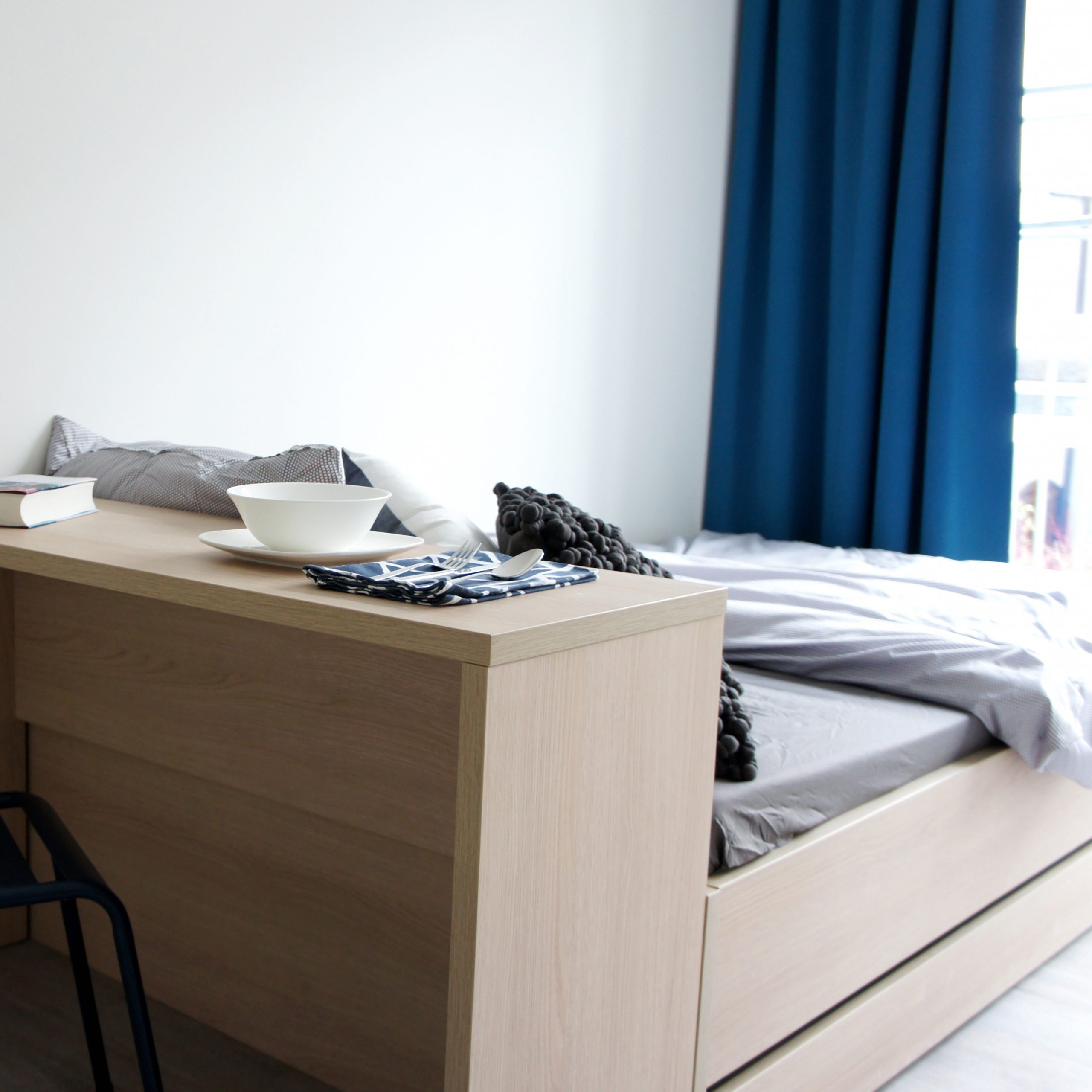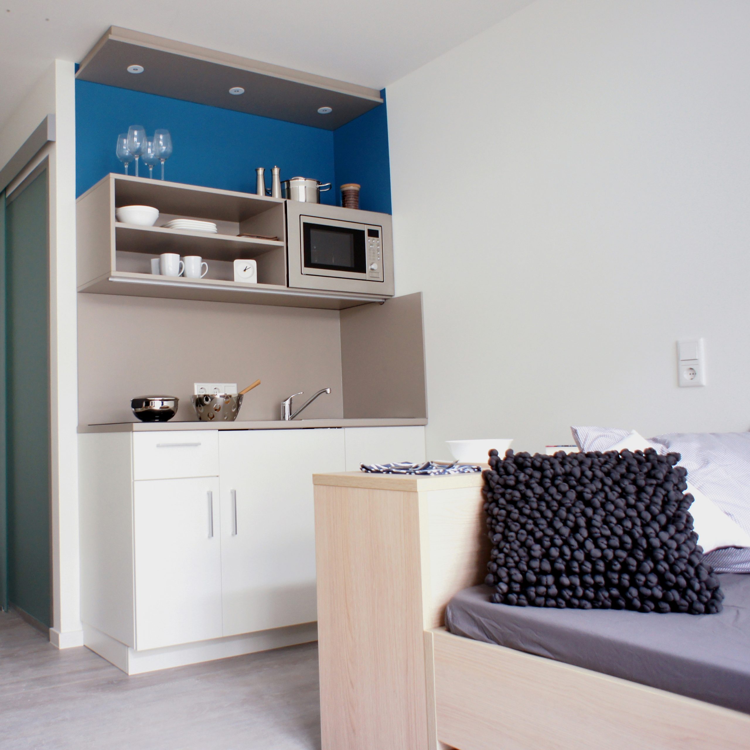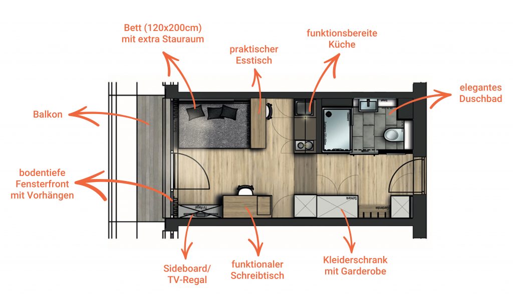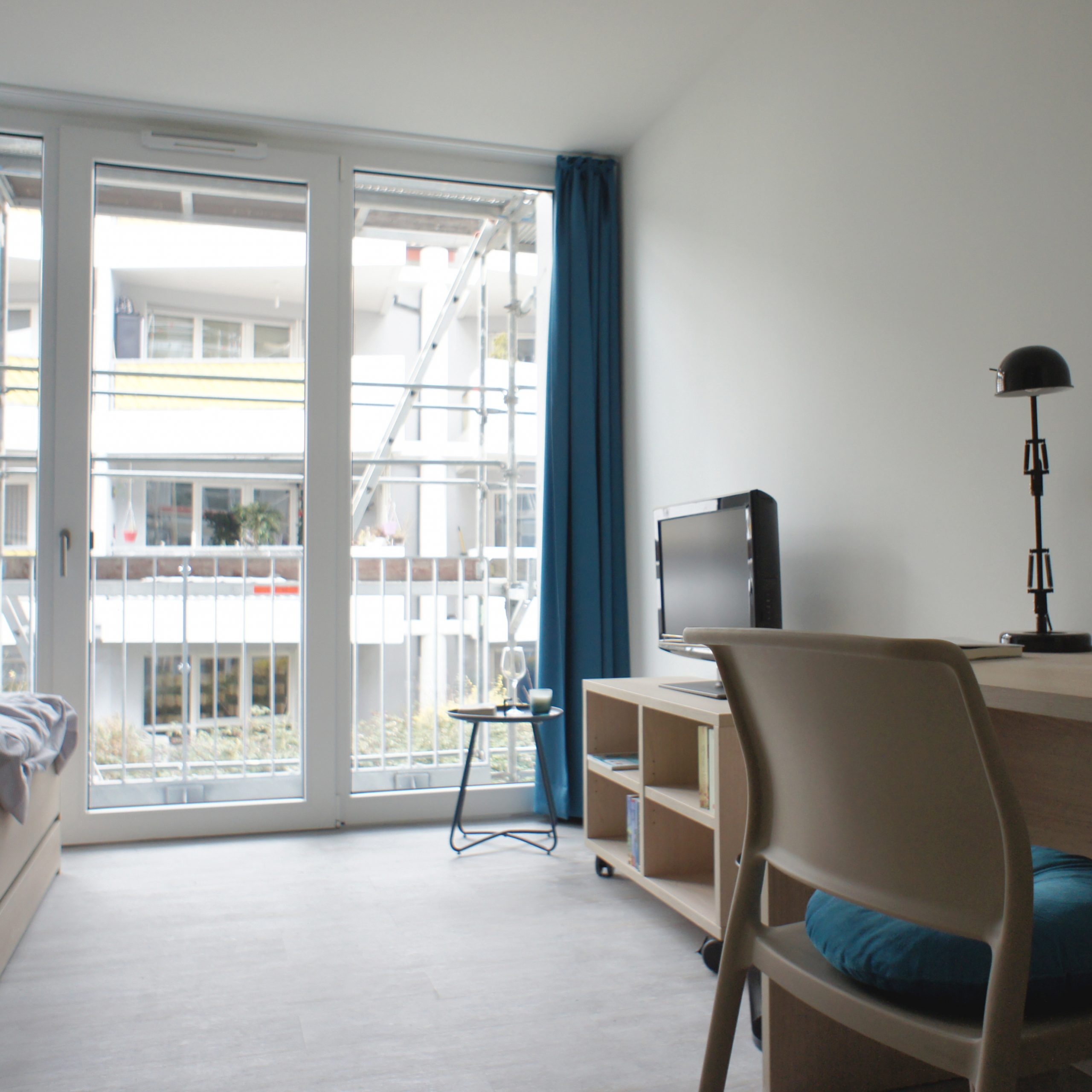Auf 22 Quadratmetern bietet dir unser ‚Balcony‘ Apartment nicht nur alles, was du zum Leben und Studieren brauchst, sondern auch noch einen traumhaften französischen Balkon..