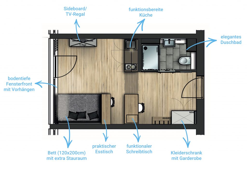 Bett (120x200cm) | Schreibtisch | Esstisch | TV-Regal | großer Kleiderschrank | Garderobe | modernes Duschbad | praktische Küchenzeile mit Cerankochfeld, Mikrowelle & Kühlschrank | Lichtkonzept im gesamten Apartment | Spiegelschrank | Verdunklungsvorhänge