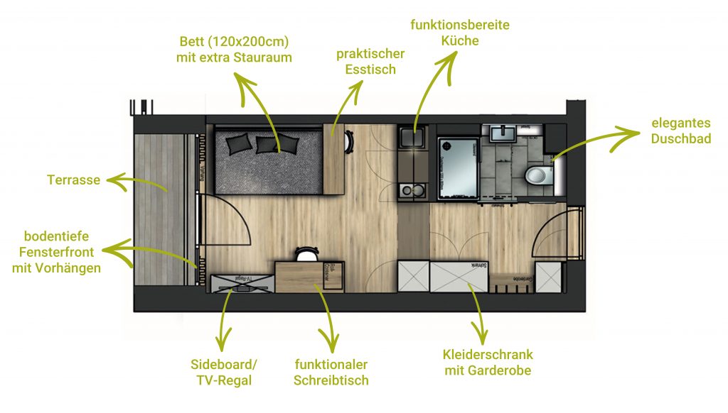 Auf 22 Quadratmetern bietet dir unser ‚Patio‘ Apartment nicht nur alles, was du zum Leben und zum Studieren brauchst, sondern auch noch eine wundervolle Terrasse.