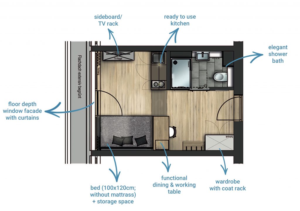 Bed (100x200cm) | Writing Desk & Dining Table | TV shelf | Closet| Wardrobe | modern Shower Bathroom | practical Kitchenette with ceramic hob, microwave & fridge | Lighting Concept for the entire apartment | Blackout Curtains